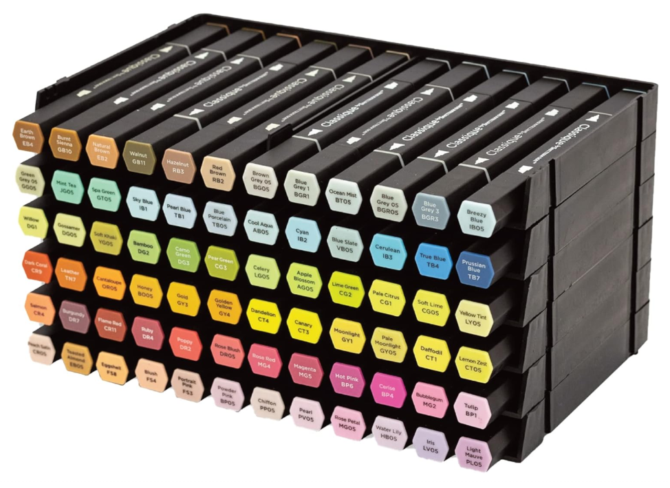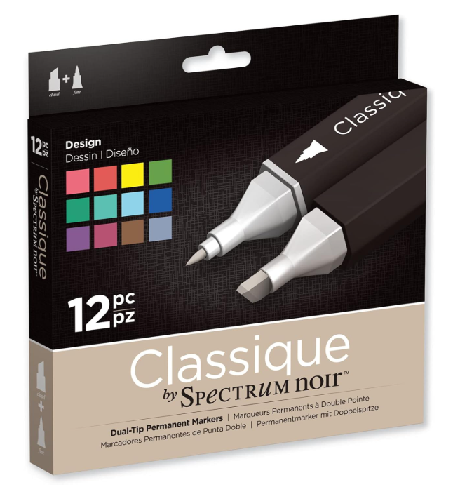 To store Spectrum Noir markers, keep them horizontal rather than upright to prevent the ink from pooling in the nib. Store in a marker case or pencil box with the caps securely fastened. Keep markers away from direct sunlight and excessive heat. Swatch the markers periodically to prevent dried out nibs.