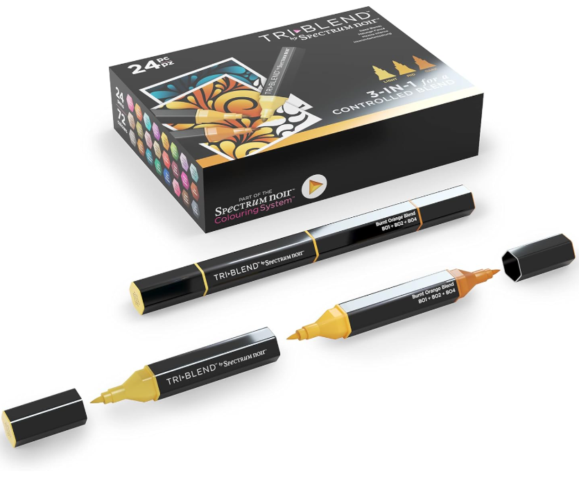 The key difference between Spectrum Noir Tri Blend and Original markers is that Tri Blend markers have three nibs – a fine nib, brush nib, and chisel nib. This allows more versatility when coloring and blending. Original Spectrum Noir markers just have a bullet nib.